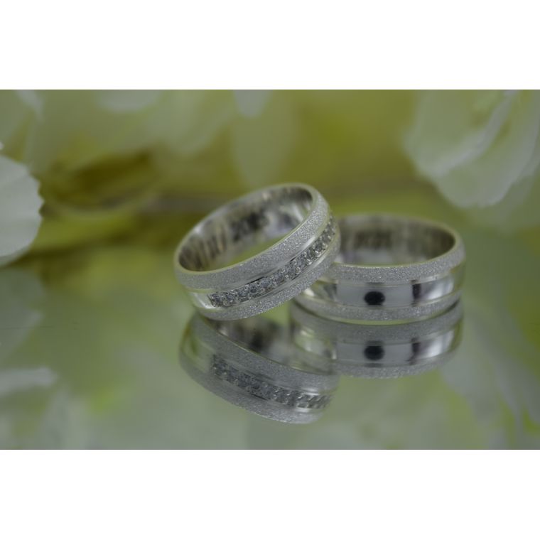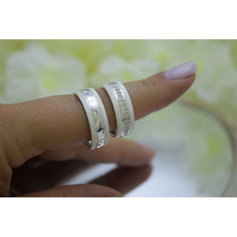 Modelo Constelação inspirada no brilho eterno das estrelas, este par une a sofisticação da prata polida com a textura exclusiva do acabamento diamantado. A peça feminina é adornada com uma cravação delicada de zircônias, simbolizando a luz que guia o relacionamento. Uma escolha perfeita para casais que brilham juntos.