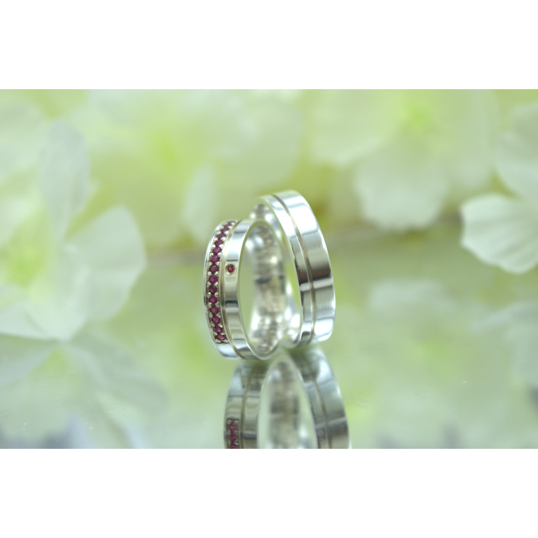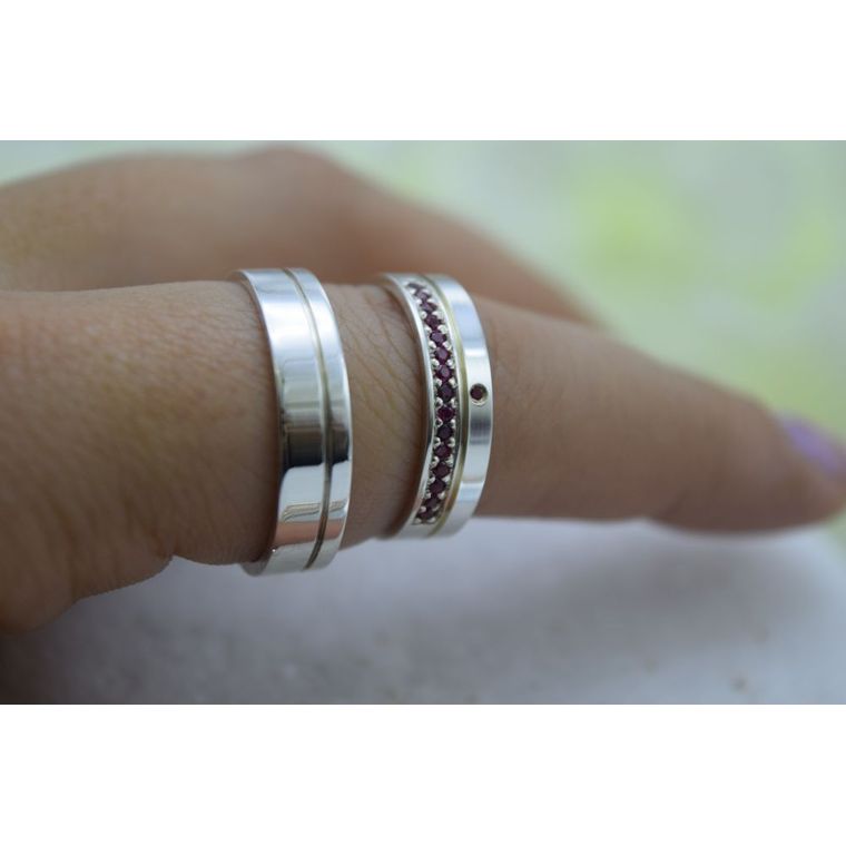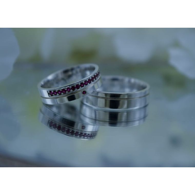 Para quem não tem medo de brilhar. Este par de 5mm em prata une a sobriedade do metal nobre com o fogo das zircônias vermelhas, transformando a aliança em uma joia memorável.