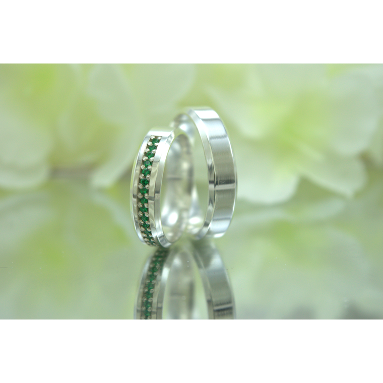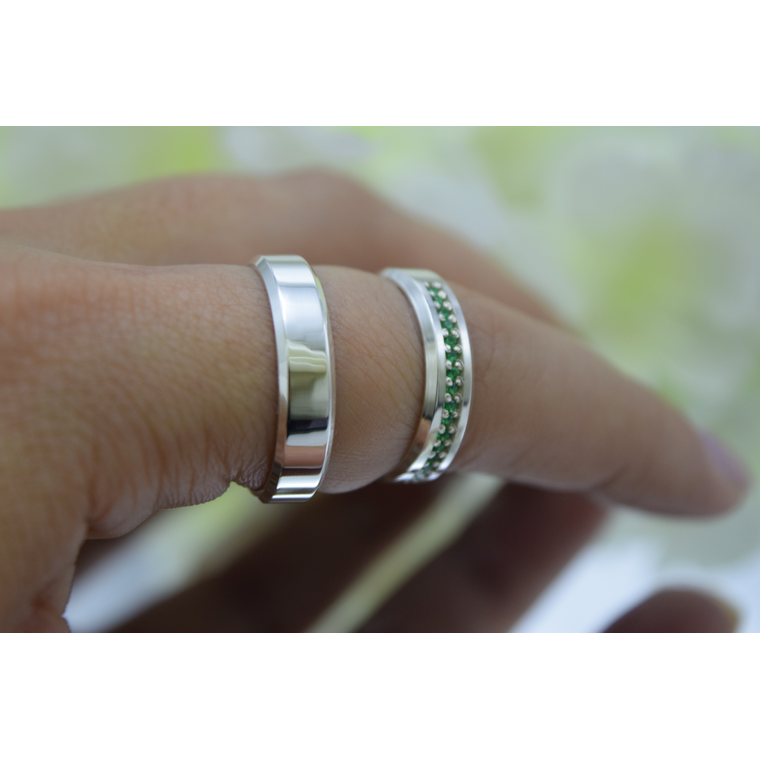 Nosso modelo Esmeralda, com 5mm de largura, remete aos ângulos e reflexos das bordas chanfradas, o destaque central fica por conta das zircônias cravejadas em um tom verde, remetendo à beleza das esmeraldas. A cor verde simboliza o equilíbrio, a saúde e a vitalidade do amor.